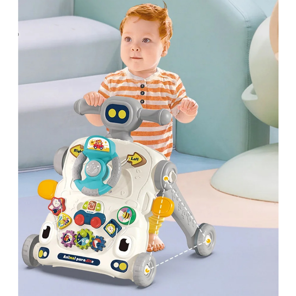 واکر 6 کاره در حالت های مختلفی از جمله اسکوتری، نشیمن دار و حالت میز بازی مورد استفاده قرار میگیرد ( داخل تصاویر سایت نشان داده شده) و شما با خرید این محصول، یک مجموعه ی کامل بازی برای کودکتان تهیه میکنید. این واکر موزیکال و چراغ دار بوده و اسباب بازی های آموزشی طراحی شده روی آن، به تقویت هوش، قدرت شنوایی و تشخیص رنگها کمک میکند.