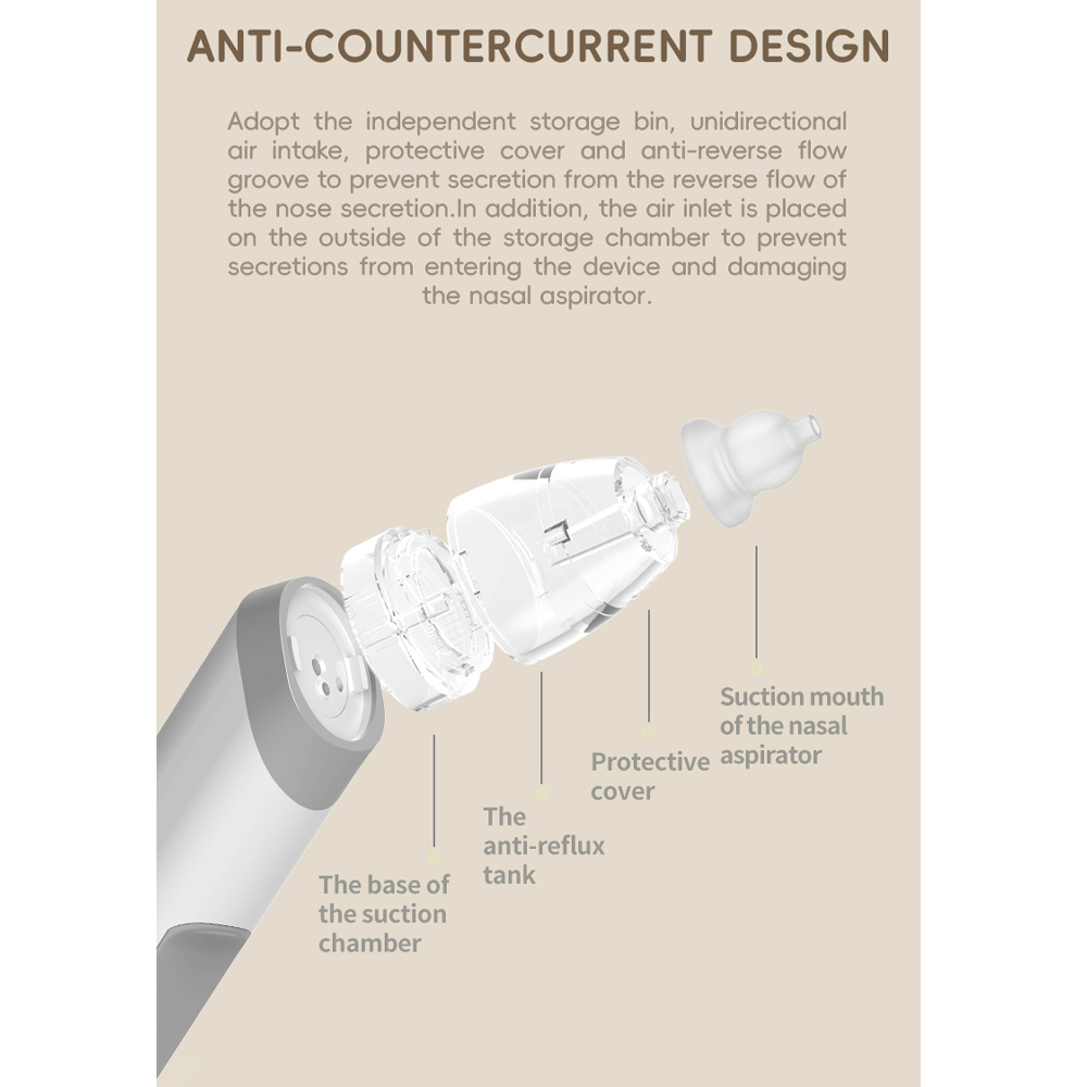 سریهای سیلیکونی مخصوص کودک از جنس سیلیکون مواد غذایی، بدون BPA و لاتکس هستند و کاملاً ایمن برای تماس با بینی حساس نوزاد طراحی شدهاند. همچنین، محفظه شفاف جمعآوری مخاط بهراحتی جدا شده و قابل شستوشو با آب گرم و صابون است تا بهداشت دستگاه بهطور کامل حفظ شود.